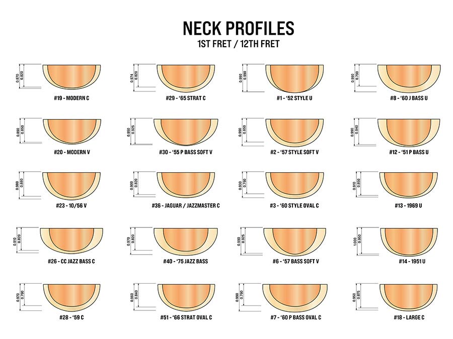 - Halsdicke: 0,90" am ersten Bund, 0,99" am zwölften Bund