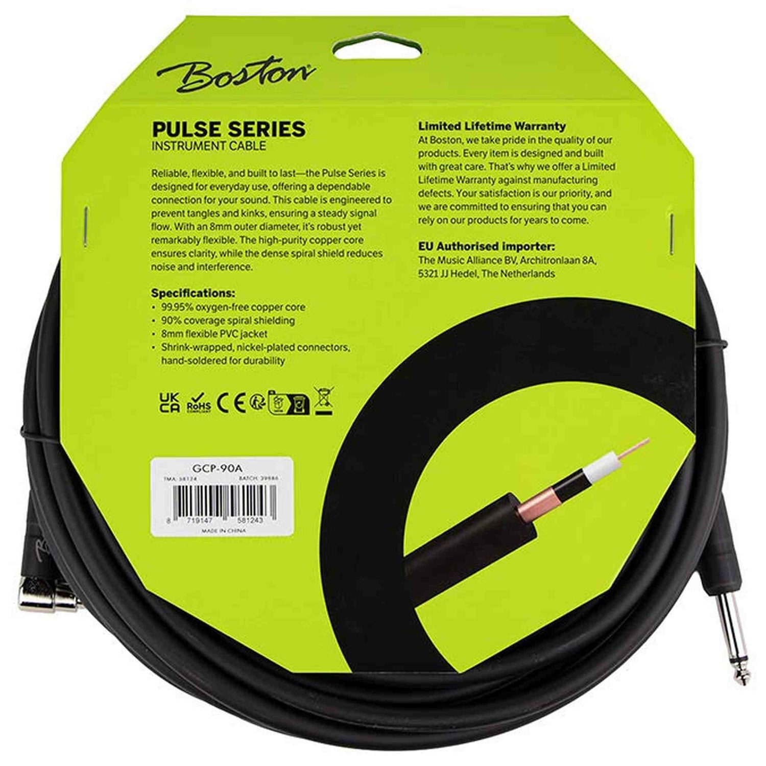 Das Boston GCP-90A aus der Pulse-Serie ist ein 9 Meter langes Instrumentenkabel mit einem geraden Klinkenstecker an einem Ende und einem Winkelstecker am anderen. Dieses Kabel ist ideal für Live-Auftritte, bei denen viel Bewegungsfreiheit benötigt wird und gleichzeitig eine sichere Verbindung zum Instrument oder Pedalboard gewährleistet sein muss. Die flexible Ummantelung verhindert Knicke und Kabelbrüche.