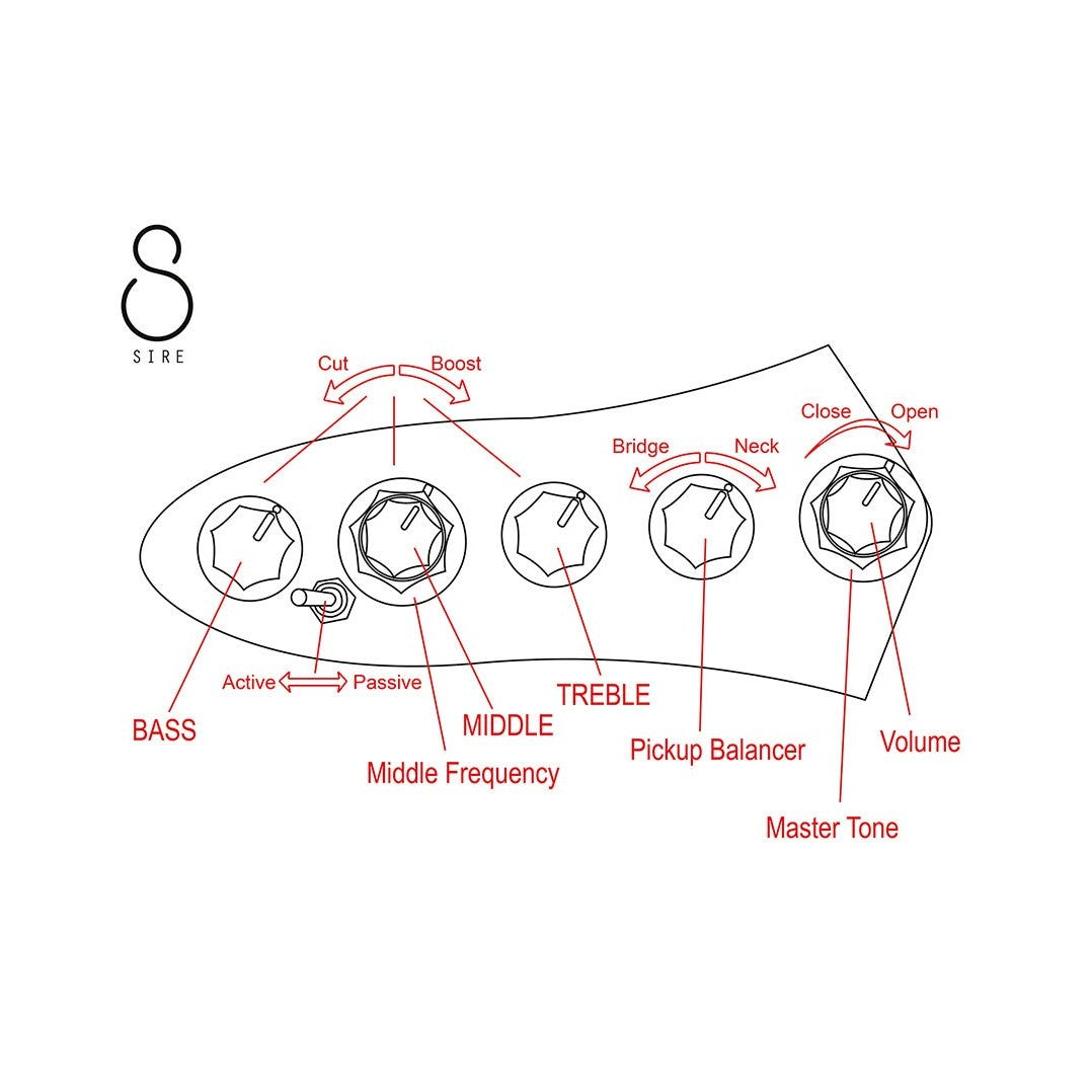 - Bedienelemente: Lautstärke und Klangfarbe (Doppelpotentiometer), Tonabnehmer-Mixer, Höhen, Mitten und Mittenfrequenz (Doppelpotentiometer), Bässe, Mini-Kippschalter (aktiv und passiv)