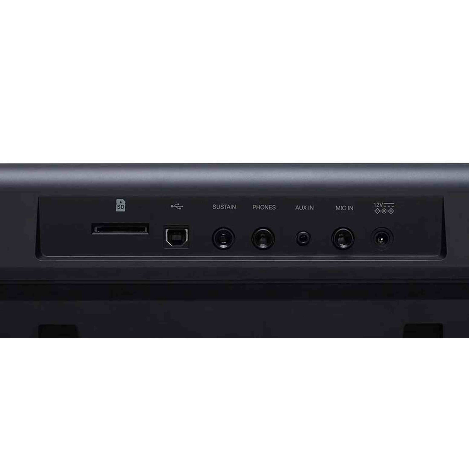 - Aansluitingen: DC-power, USB-MIDI / USB-AUDIO, hoofdtelefoon/output (6,3 mm jack), input (3,5 mm jack), microfoon (6,3 mm jack), sustain pedaal (6,3 mm jack), SD card slot
