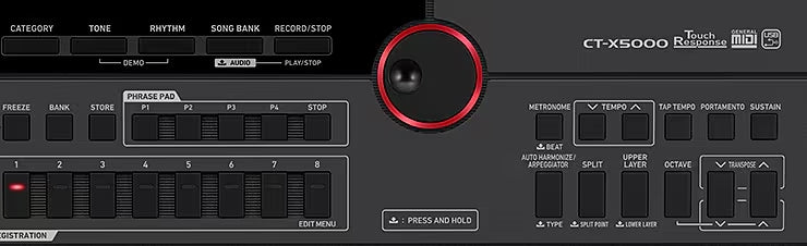 Das Keyboard verfügt über 61 anschlagdynamische Tasten und unterstützt Layer- und Split-Spielmodi. Dank Anschlussmöglichkeiten wie USB, Audio-In, Line-Out und Pedaleingang lässt es sich mühelos in jedes Studio- oder Live-Setup integrieren. Mit dem mitgelieferten Netzteil, einer Vielzahl integrierter Funktionen und der Unterstützung von SMF- und Audiodateien über USB-Stick ist das CT-X5000 ein äußerst komplettes und professionelles Instrument für jeden Keyboarder.