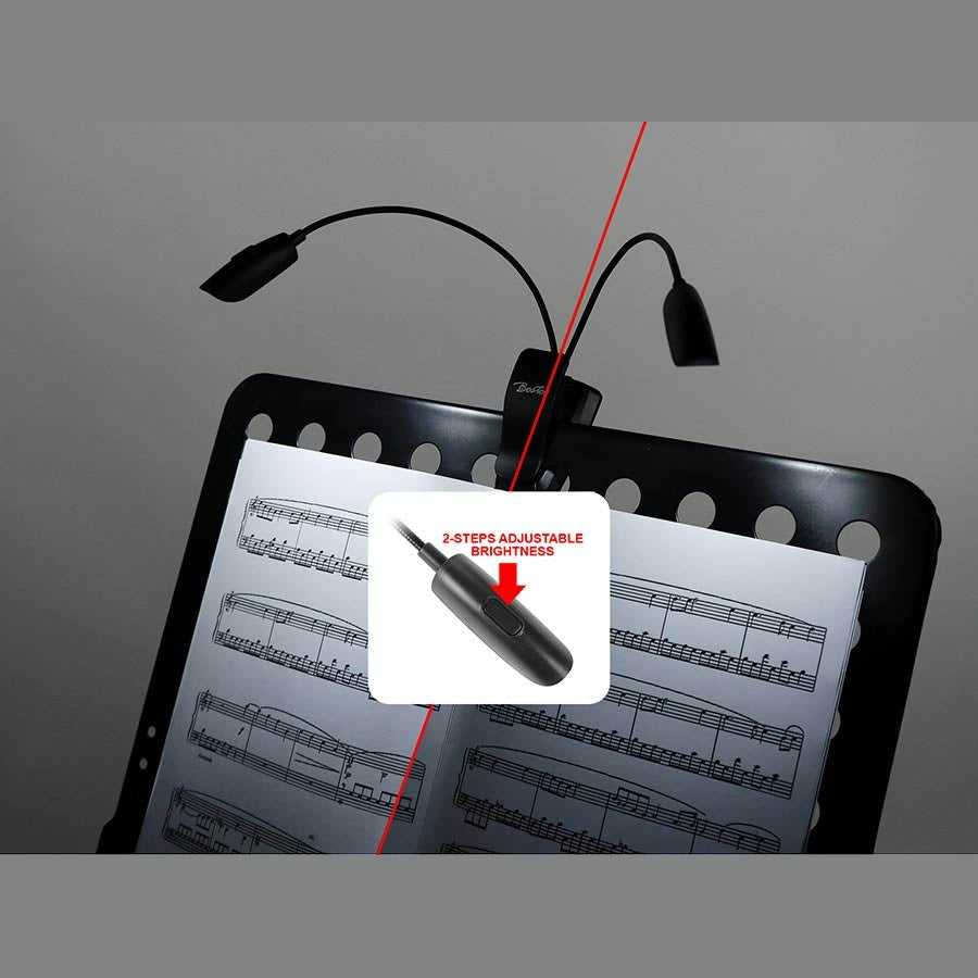 Die Boston MSL-606 ist eine praktische und kompakte Notenpultlampe, ideal für Musiker und Leser. Ausgestattet mit sechs extrahellen LEDs (drei pro Lampenkopf) bietet sie eine kraftvolle, kühle, weiße Beleuchtung mit zwei Helligkeitsstufen . Die beiden flexiblen Schwanenhälse (24 cm) ermöglichen eine optimale Positionierung, während der stabile Clip die einfache Befestigung an nahezu jedem Notenpult erlaubt. Die Lampe wird mit den mitgelieferten drei AAA-Batterien betrieben, kann aber auch mit einem optionalen USB-Netzteil verwendet werden.