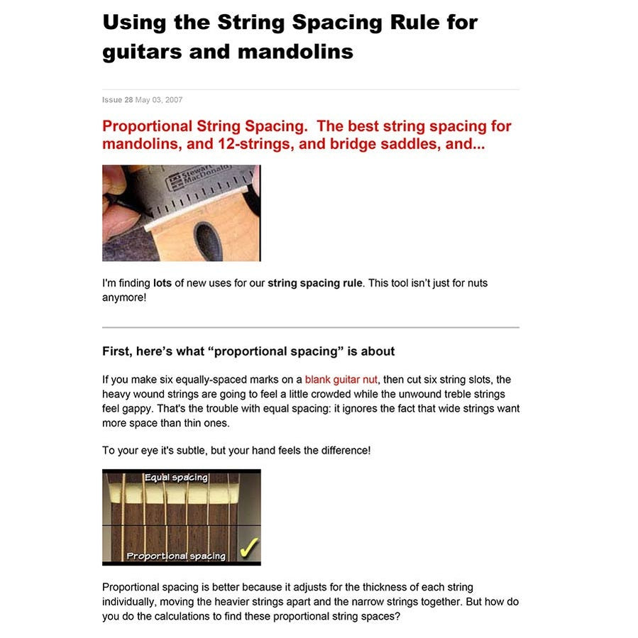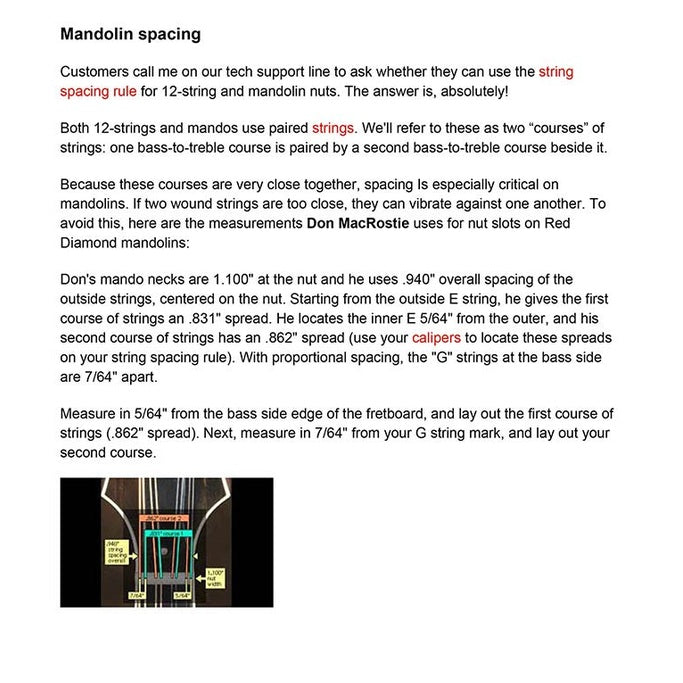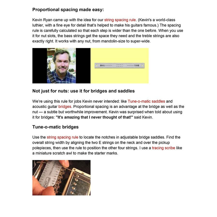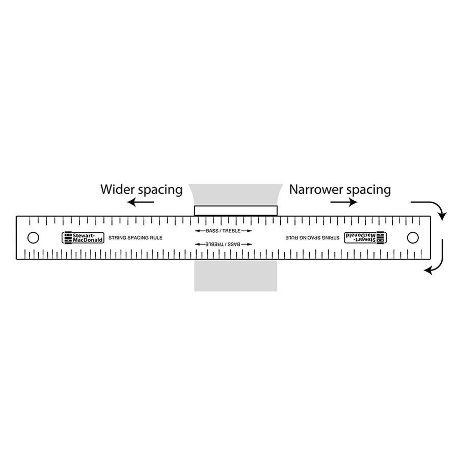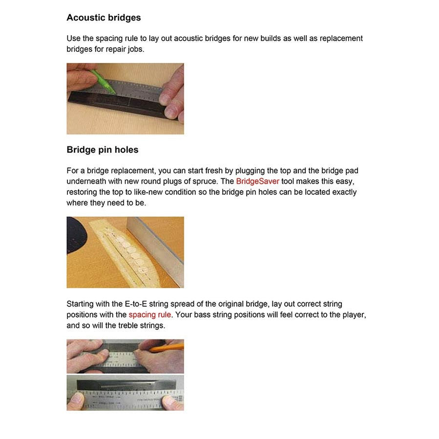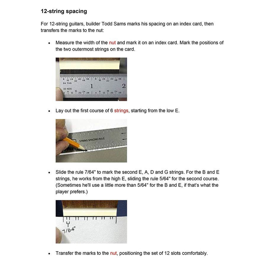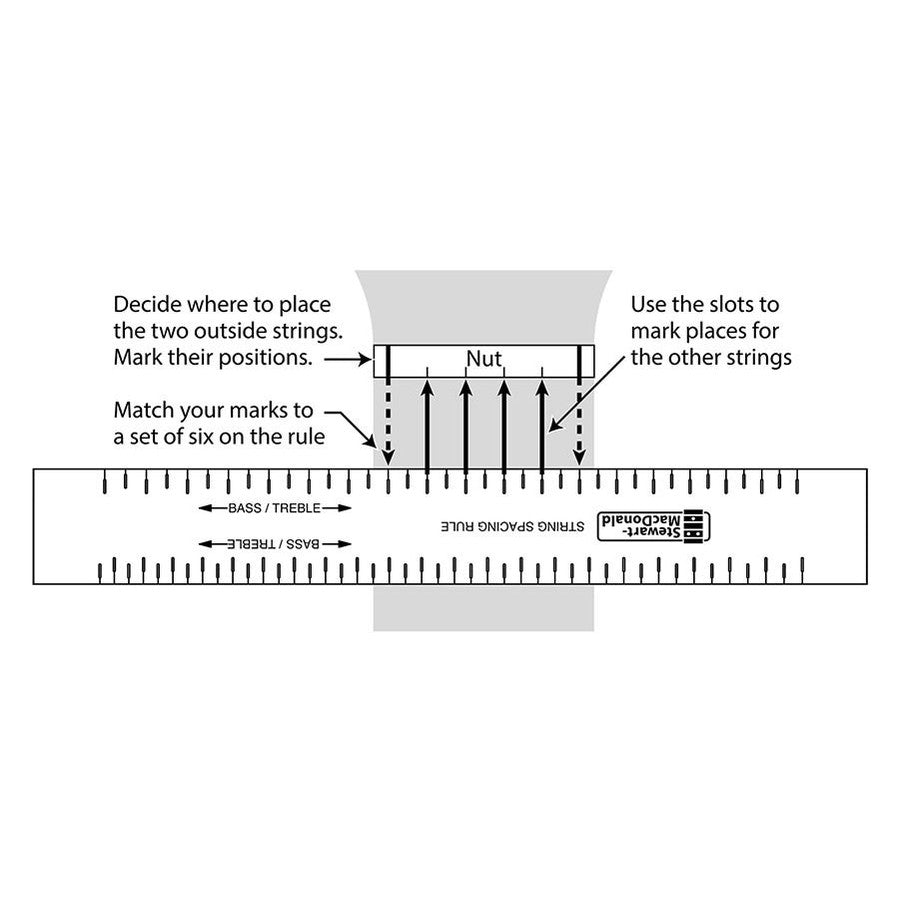 Das Lineal ist flexibel und eignet sich sowohl für ebene als auch für gewölbte Oberflächen. Markieren Sie einfach die Positionen der äußeren Saiten und schieben Sie das Lineal auf dem Instrument, bis die Kerben übereinstimmen. So können Sie alle Saitenpositionen im Handumdrehen mit einem Anreißnadel oder Bleistift markieren. Dieses Lineal ist ideal zum Markieren von Sattelkerben, Stegeinlagen, Wirbellöchern und vielem mehr – für Gitarren, Mandolinen, Banjos und Violinen.