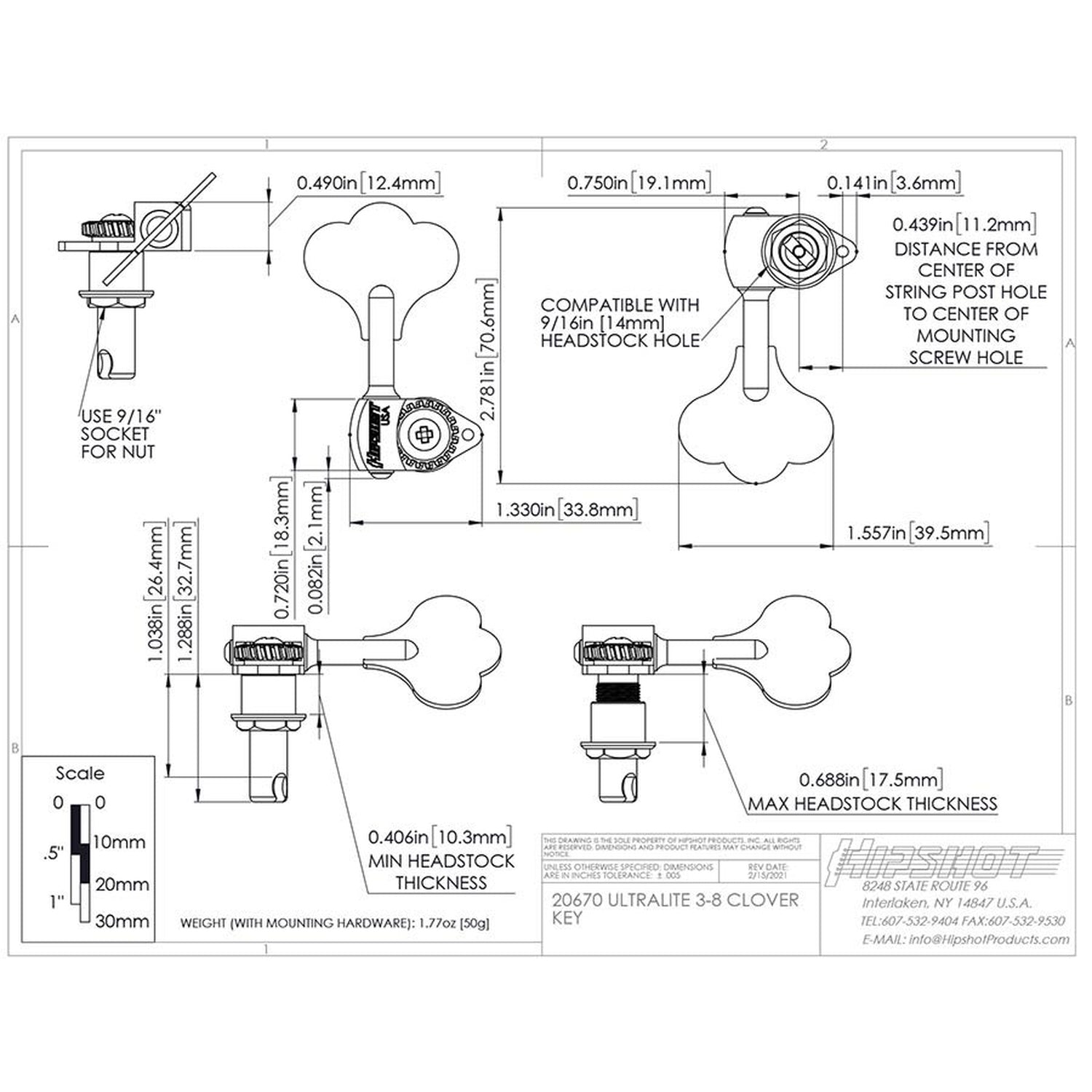 Hipshot HS0670CT HB6 3/8" USA Ultralite Bass-Tuning-Maschine, Chrom, Clover Key, Höhenseite