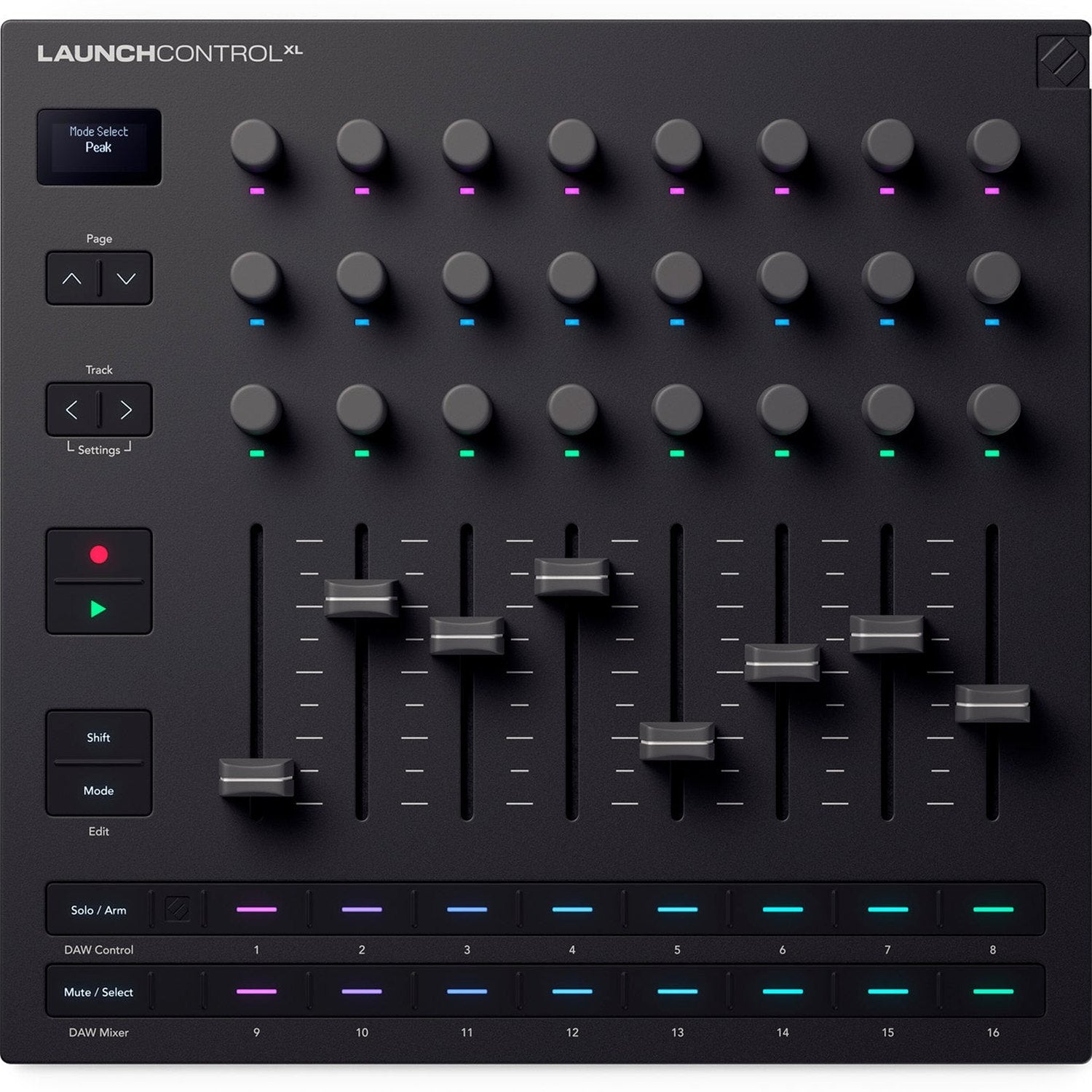 Der Novation Launch Control XL 3 ist ein leistungsstarker und vielseitiger USB-MIDI-Controller , der für die vollständige Steuerung von DAWs, Software-Synthesizern, Effekten und externer Hardware entwickelt wurde. Ausgestattet mit 8 60-mm-Fadern in voller Länge , 24 Endlos-Encodern mit RGB-LED-Anzeige und 16 frei belegbaren Drehreglern bietet dieser Controller maximale Flexibilität für Produktion und Live-Auftritte. Das helle OLED-Display liefert sofortiges visuelles Feedback, während dedizierte Transporttasten für Wiedergabe/Stopp und Aufnahme einen reibungslosen Workflow gewährleisten. Bis zu 15 Benutzermodi können gespeichert werden, sodass Sie den Launch Control XL 3 optimal an Ihre Arbeitsweise anpassen können.