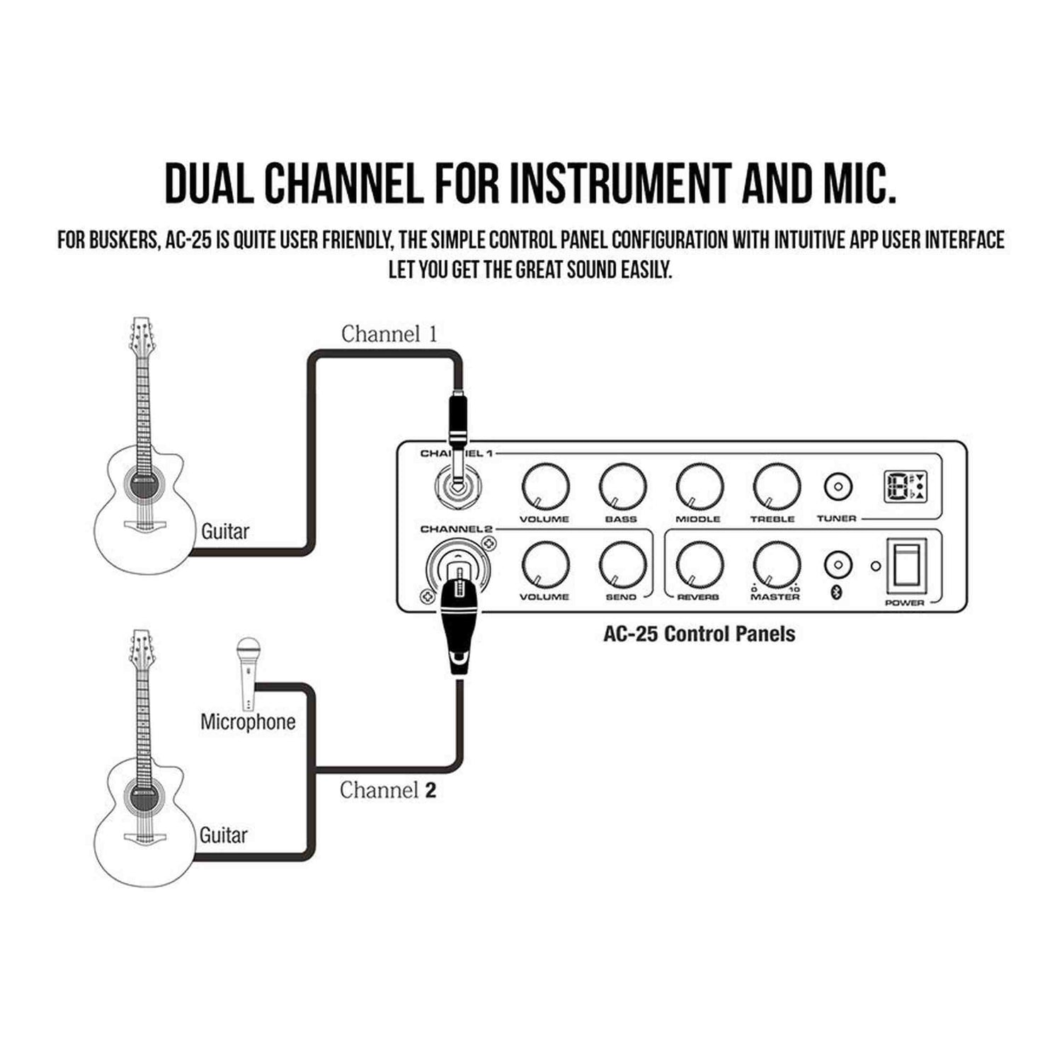NUX AC-25 Akustikgitarrenverstärker, 25 W, 2 Kanäle, Bluetooth, mit Batterie