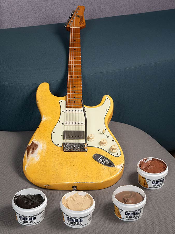 Die Spachtelmasse ist ungiftig, lösungsmittelfrei und nicht entflammbar und kann daher in jeder Werkstatt bedenkenlos verwendet werden. Dank ihrer einfachen Anwendung, schnellen Trocknung, guten Schleifbarkeit sowie der Tatsache, dass sie nicht schrumpft oder reißt, ist dieses Produkt besonders anwenderfreundlich. Mischen Sie die Spachtelmasse im Verhältnis 1:2 mit Wasser, tragen Sie sie auf, entfernen Sie überschüssige Masse, lassen Sie sie trocknen und schleifen Sie die Oberfläche glatt. Der 250-ml-Becher bietet ausreichend Kapazität für präzises Arbeiten beim Gitarrenbau oder der Holzrestaurierung.