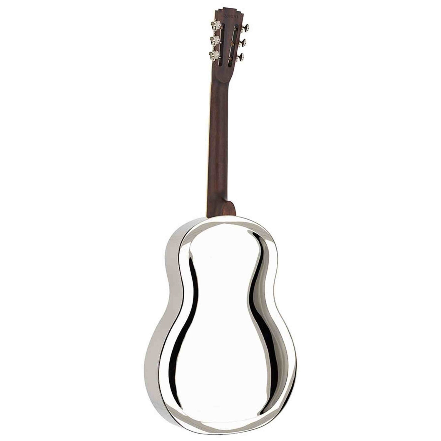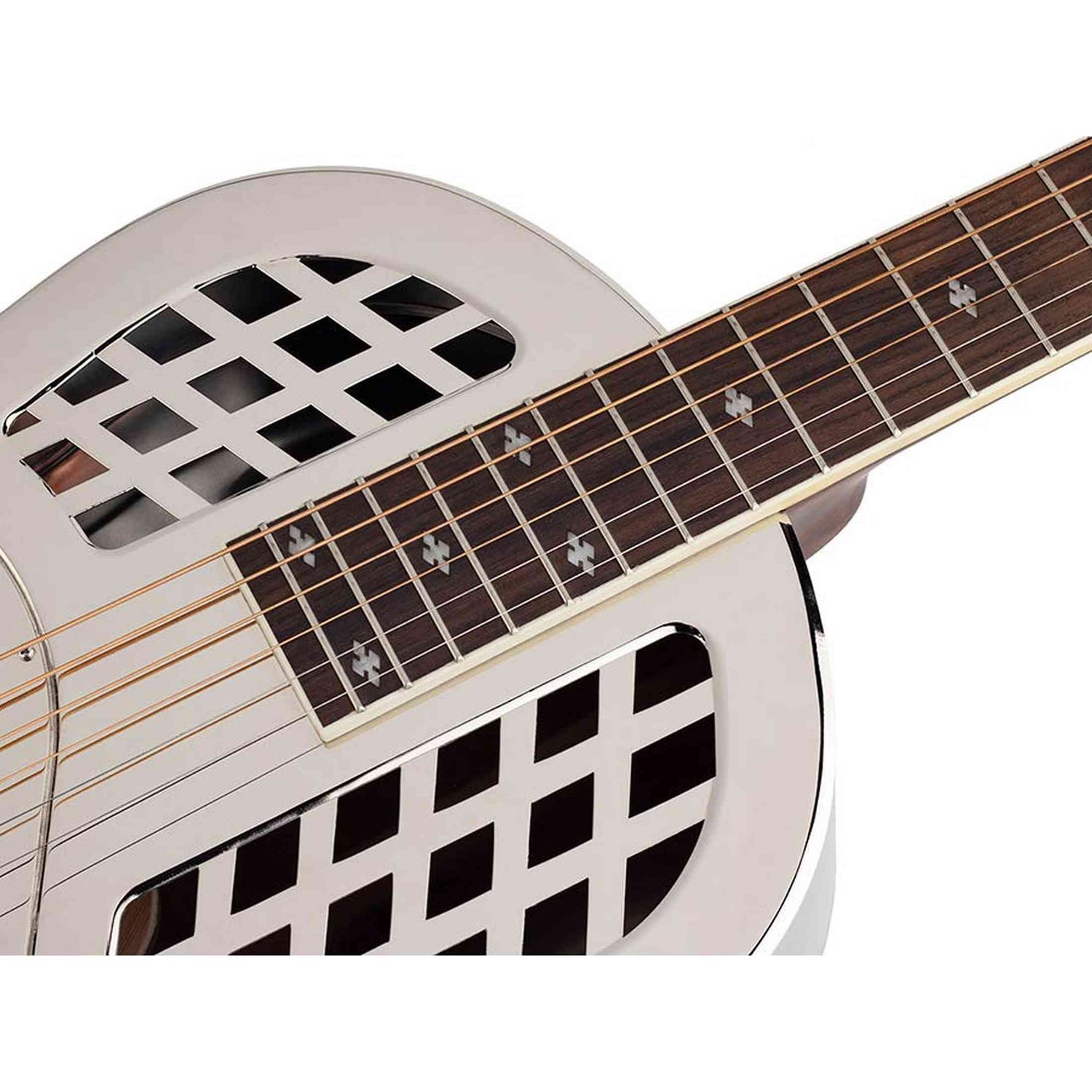 Die polierte Nickeloberfläche und das Art-déco-Design machen diesen Resonator zu einem echten Blickfang. Der seidenmatt lackierte Mahagonihals und die 46 mm Sattelbreite sorgen für ein komfortables Spielgefühl, sowohl auf dem Griffbrett als auch beim Sliden. Alle Royall-Resonatoren werden in der Werkstatt von Gitarristen selbst gebaut und gestimmt, wobei hochwertige, handgesponnene Resonatorkegel zum Einsatz kommen. Der Tampa wird mit einem leichten Softcase für den sicheren Transport geliefert.