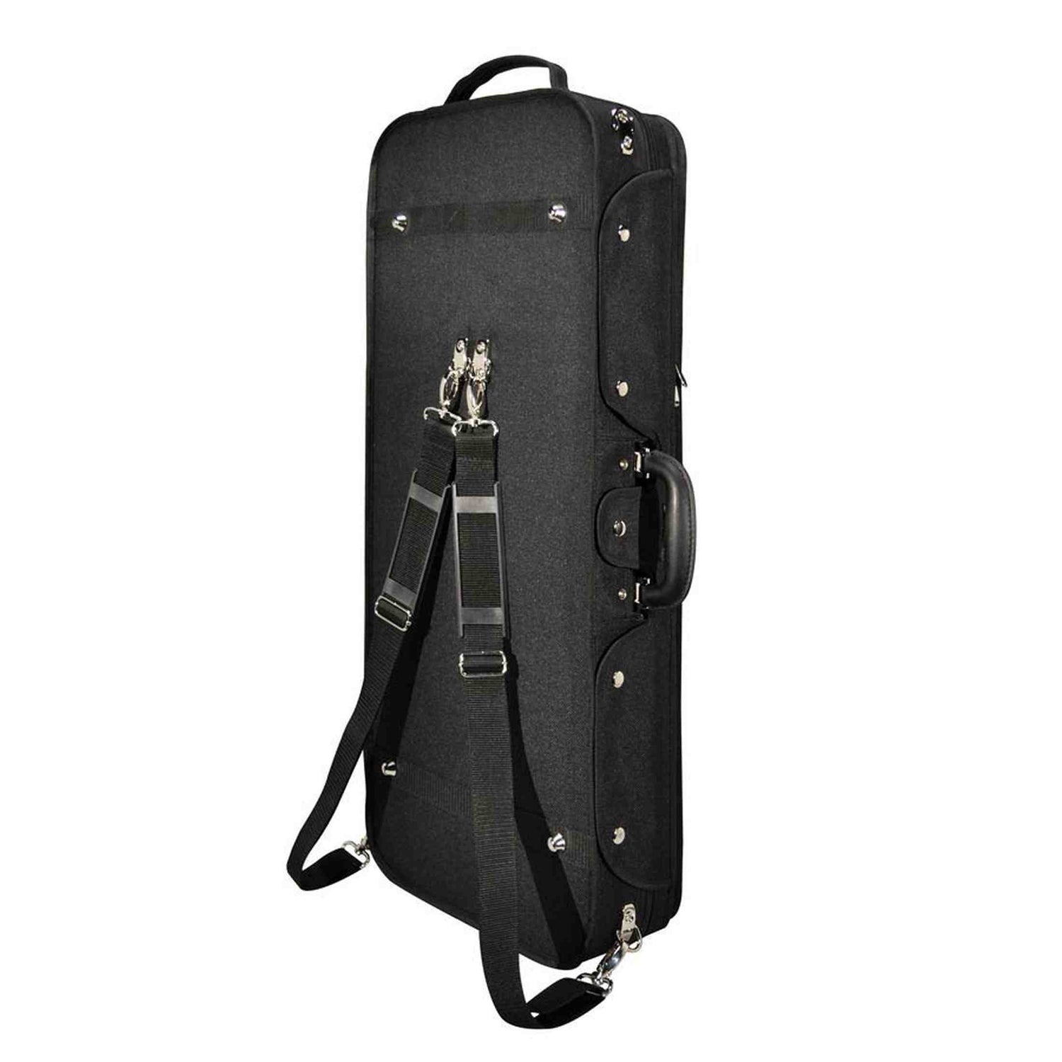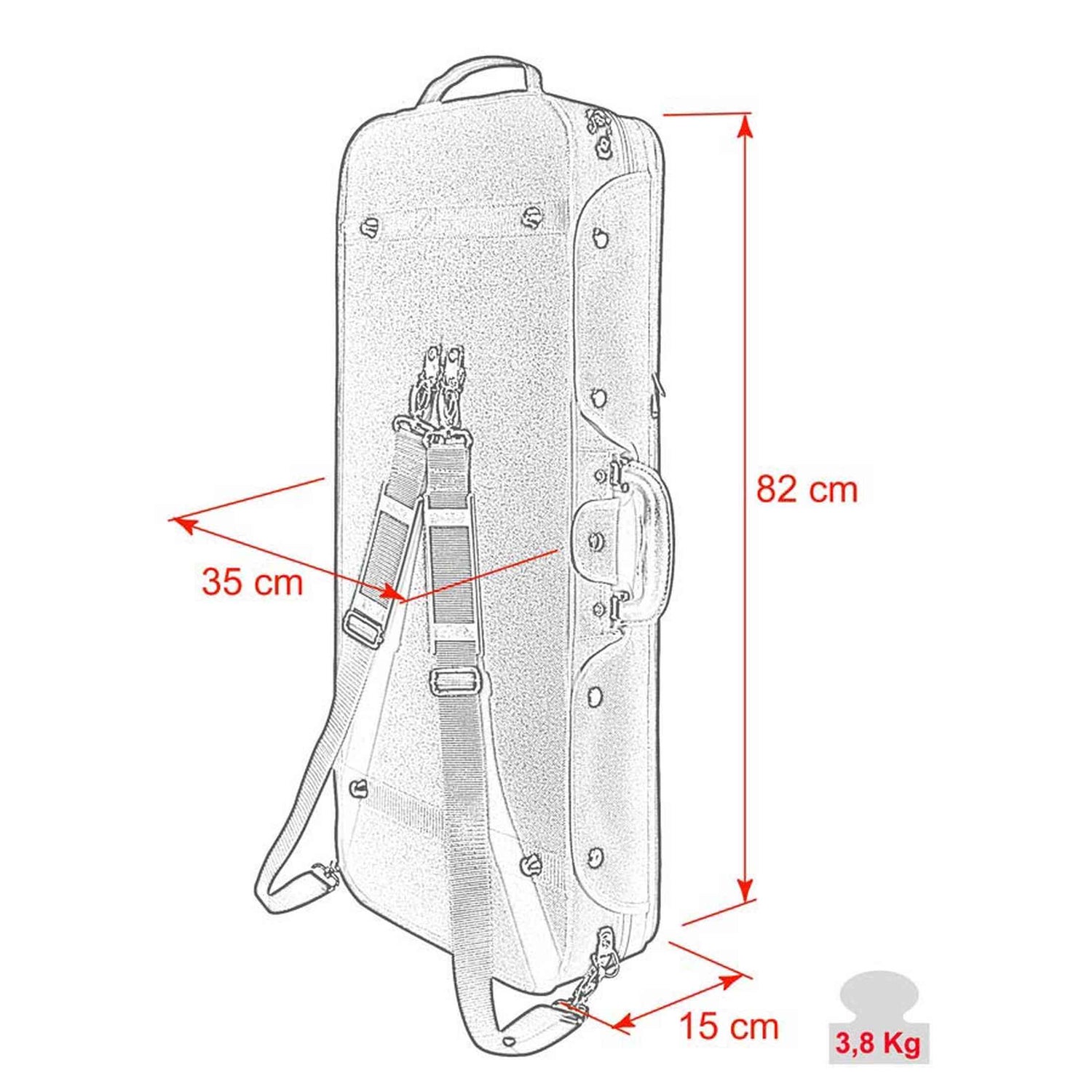 Das Außenmaterial besteht aus robustem Cordura. Der Innenraum ist mit rotem Wildleder ausgekleidet und teilweise gefüttert, um ein optimales Verhältnis zwischen Schutz und Gewicht zu gewährleisten. Bis zu vier Bögen können transportiert und Zubehör in zwei Innentaschen verstaut werden. Zwei Schultergurte sorgen für hohen Tragekomfort. Die Schutzhülle verhindert den direkten Kontakt der Geigen mit dem Deckel.