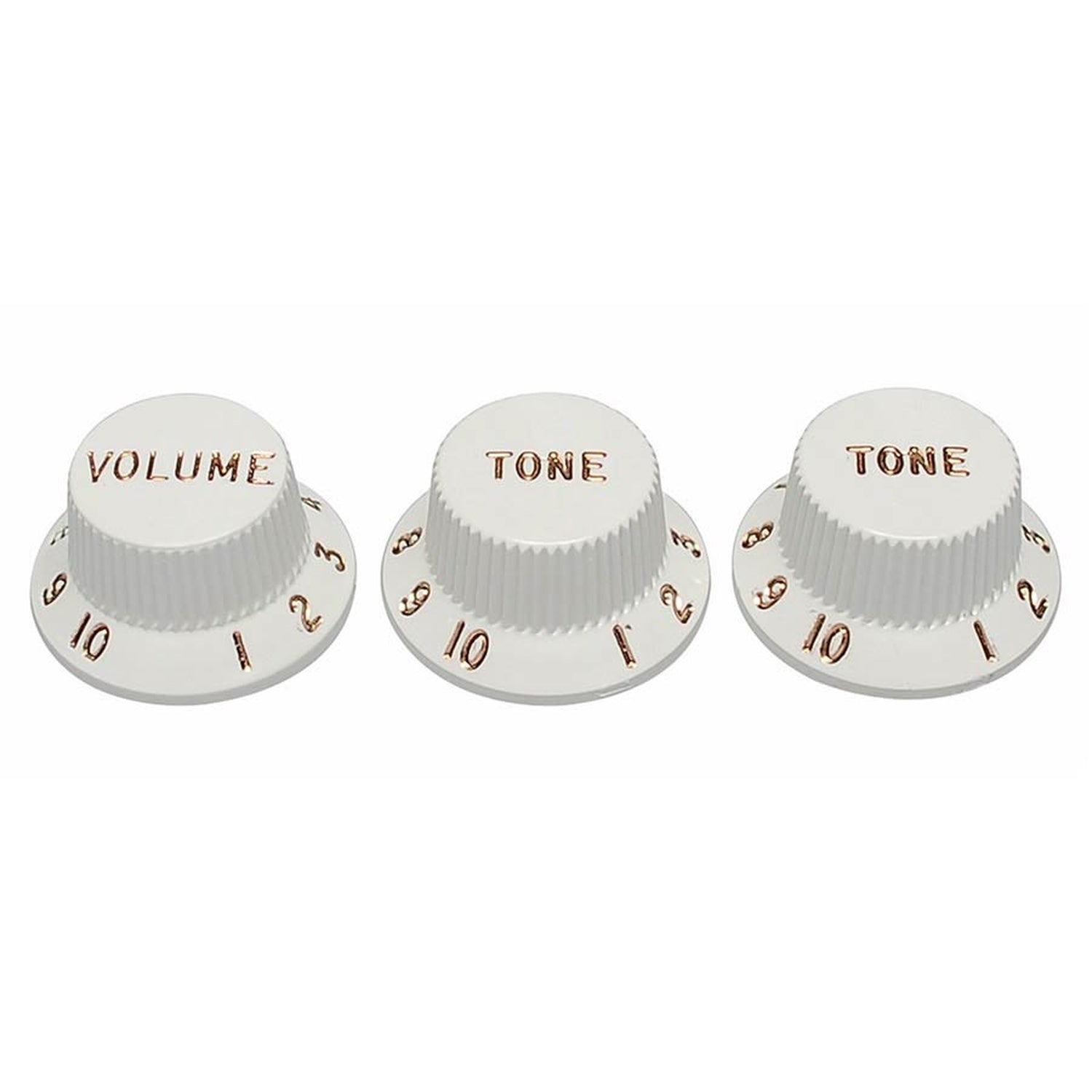 Set of three plastic push knobs designed to fit 1/4" split-shaft potentiometers on nearly all U.S. and Mexican-made Stratocaster models produced from 1954 to present.