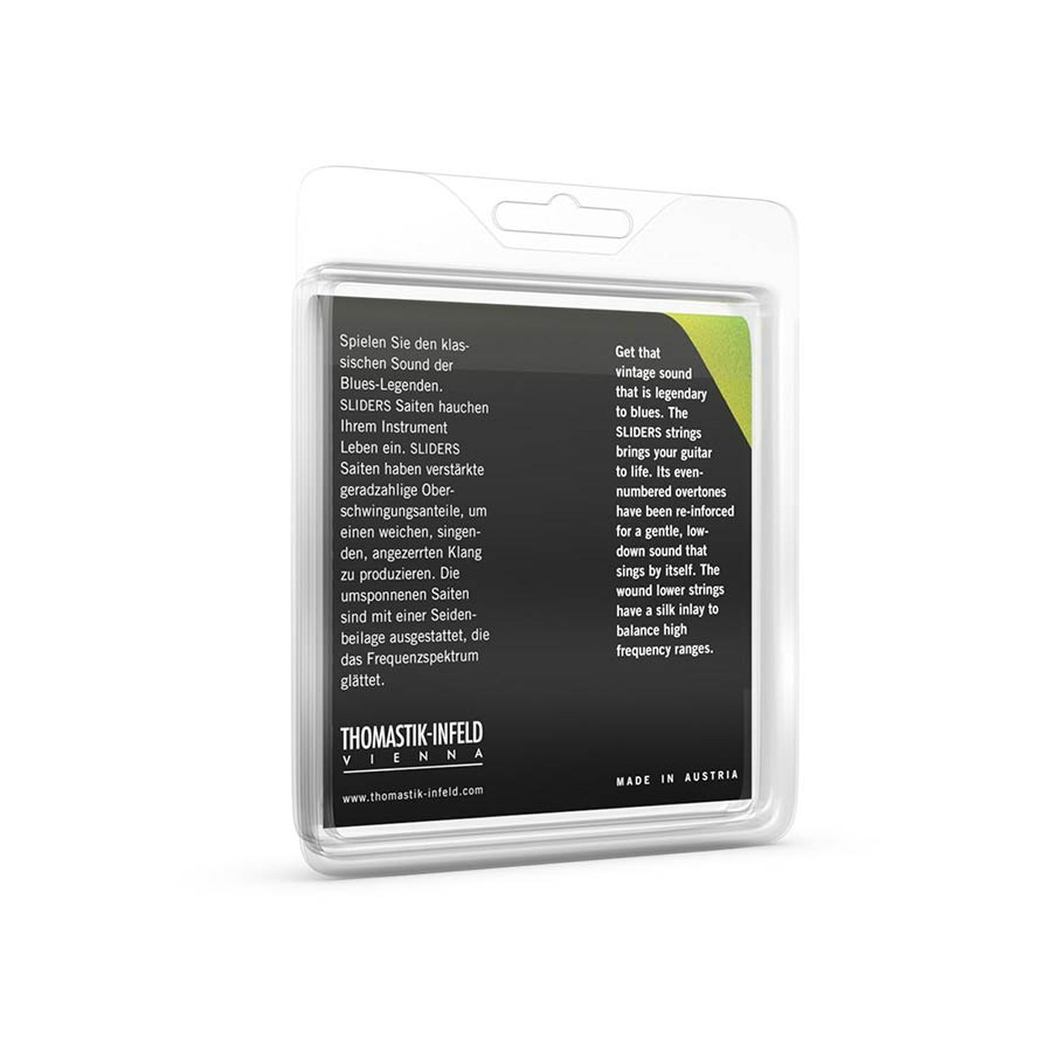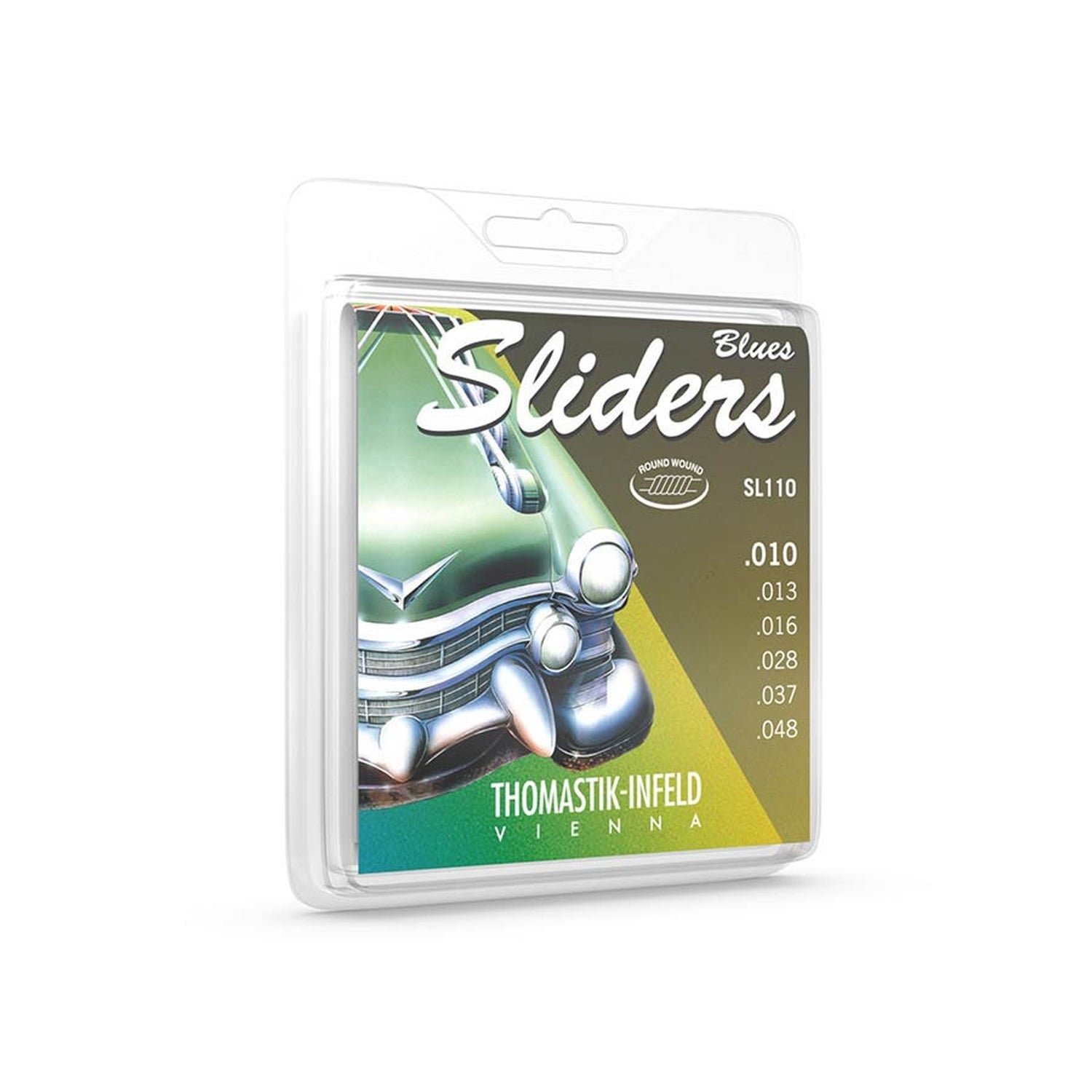 Thomastik Infeld THSL-110 string set, round wound, silk inlay, 010-013-016-028-037-048 Round wound nickel with a silk inlay (E,A,D) for a big “round” tone. Even-order harmonics are reinforced for a smooth, velvety sound reminiscent of vintage electric blues and R&B. Overdrive your amp a little and listen to them sing! BLUES SLIDERS are also perfect for classic rock, rocka billy and country.
