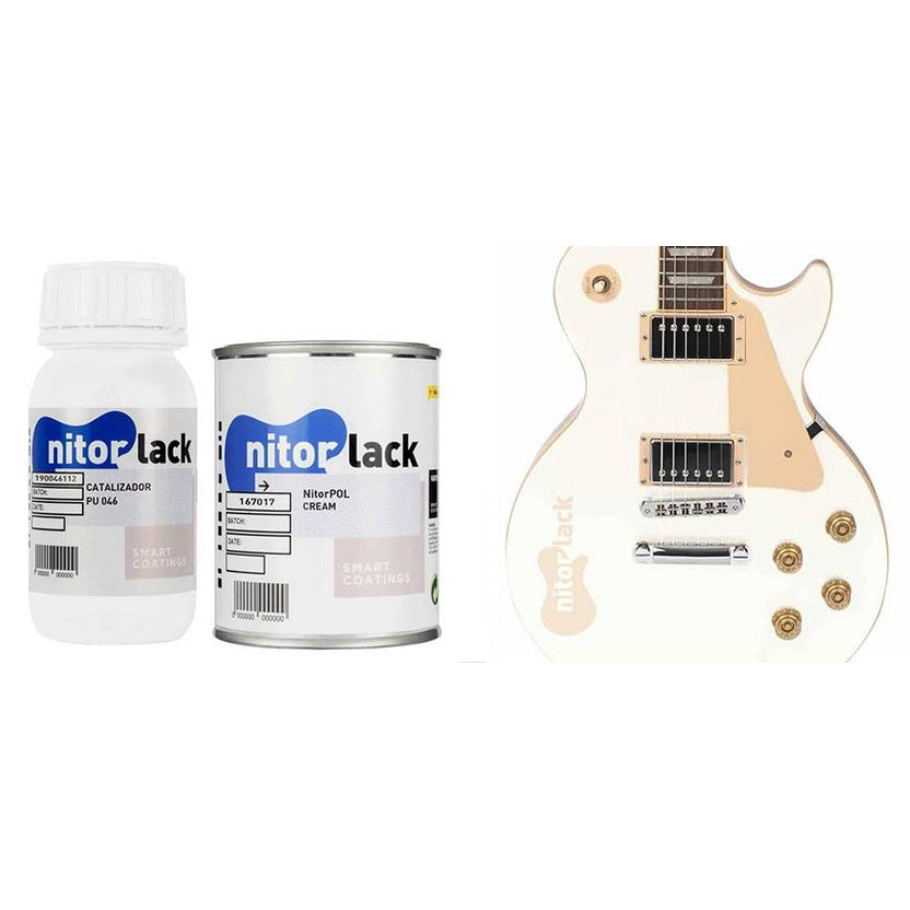 NitorLACK N167017108 is a dual-coat polyurethane lacquer in Cream , a classic Gibson finish also known as "Classic White." This warm, vintage white was often used on legendary models like the Les Paul Custom and the SG . The color approximates the classic white of vintage Fender instruments and gives any instrument an elegant, timeless look. For optimal durability and color depth, a clear topcoat is recommended.