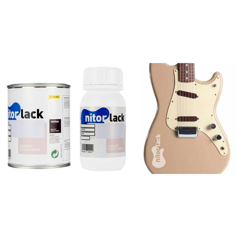 NitorLACK N167063108 is a high-quality dual-coat polyurethane lacquer in the color Desert Sand , a light, beige-like shade with a subtle reddish-yellow undertone. Originally used by General Motors for their first Cadillacs, this color also became popular with Fender in the late 1950s, especially on models such as the Musicmaster , Duo-Sonic and various lap steel guitars . The color exudes a warm, vintage look that perfectly complements classic guitar finishes.