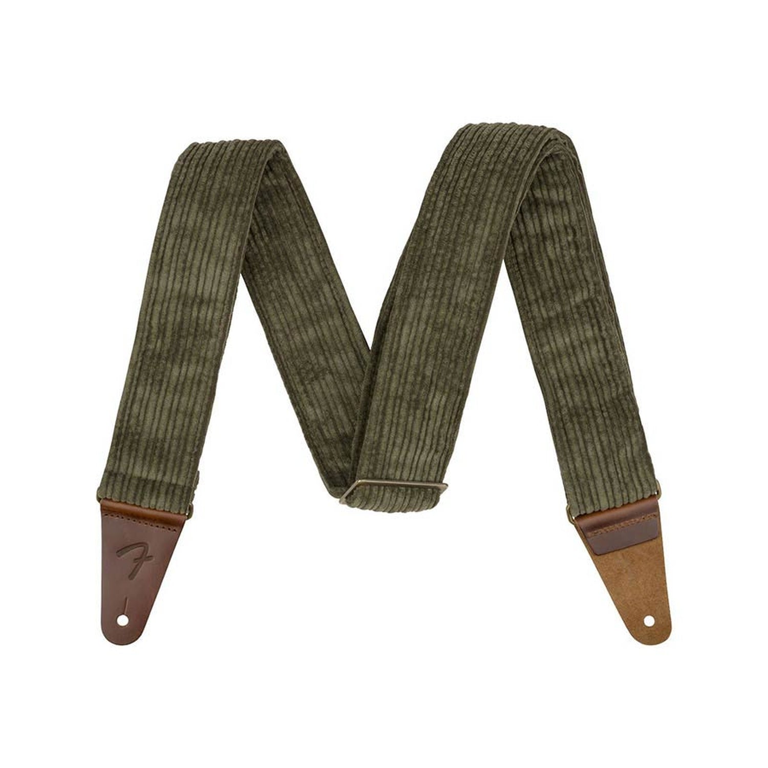 Fender 990639076 guitar strap, antique olive, polyester corduroy, antique brass hardware Our softest strap yet! Featuring three warm colorways, the Corduroy Strap is crafted from a double-sided polyester corduroy and offers full grain leather ends for ultimate comfort and durability.