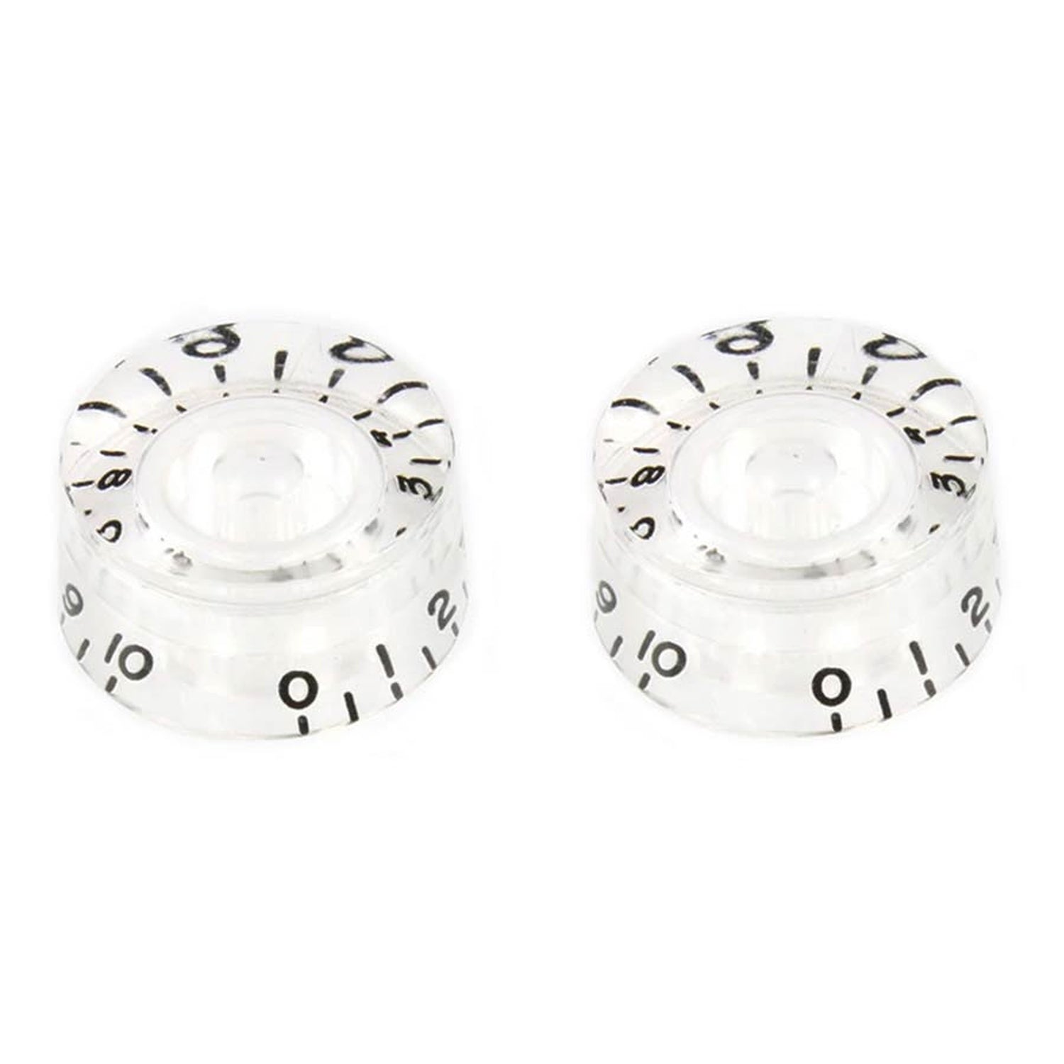 Give your instrument a vintage look with this set of two clear velocity knobs. These knobs are perfect for USA split-shaft potentiometers and add an authentic touch to your guitar or other instruments. With retro-style numbers, they're not only functional but also eye-catching. Enhance your playing experience with these quality knobs!