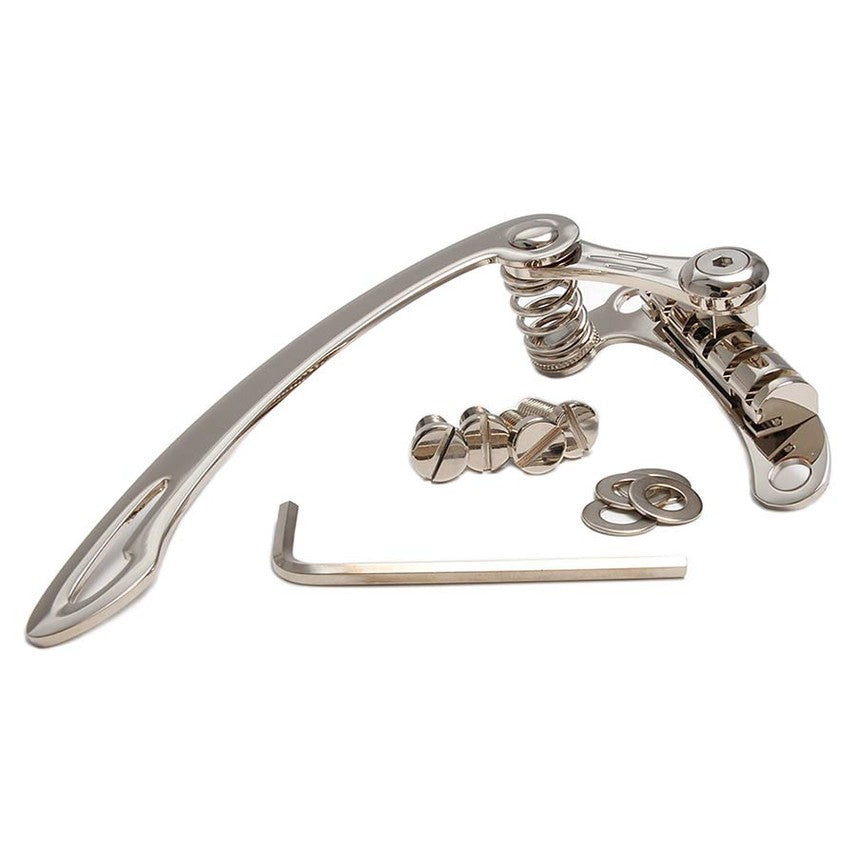 The Göldo Originals TLT2N LT2 Drop-In Vibrato System offers a stylish and practical upgrade for guitars with a stop-tail bridge. This nickel finish combines classic looks with modern functionality. Licensed by Duesenberg, this vibrato system is fully compatible with existing tailpiece mounts and can be installed without drilling or routing. Installation is simple and simply requires tightening the included screws into the existing bushings.