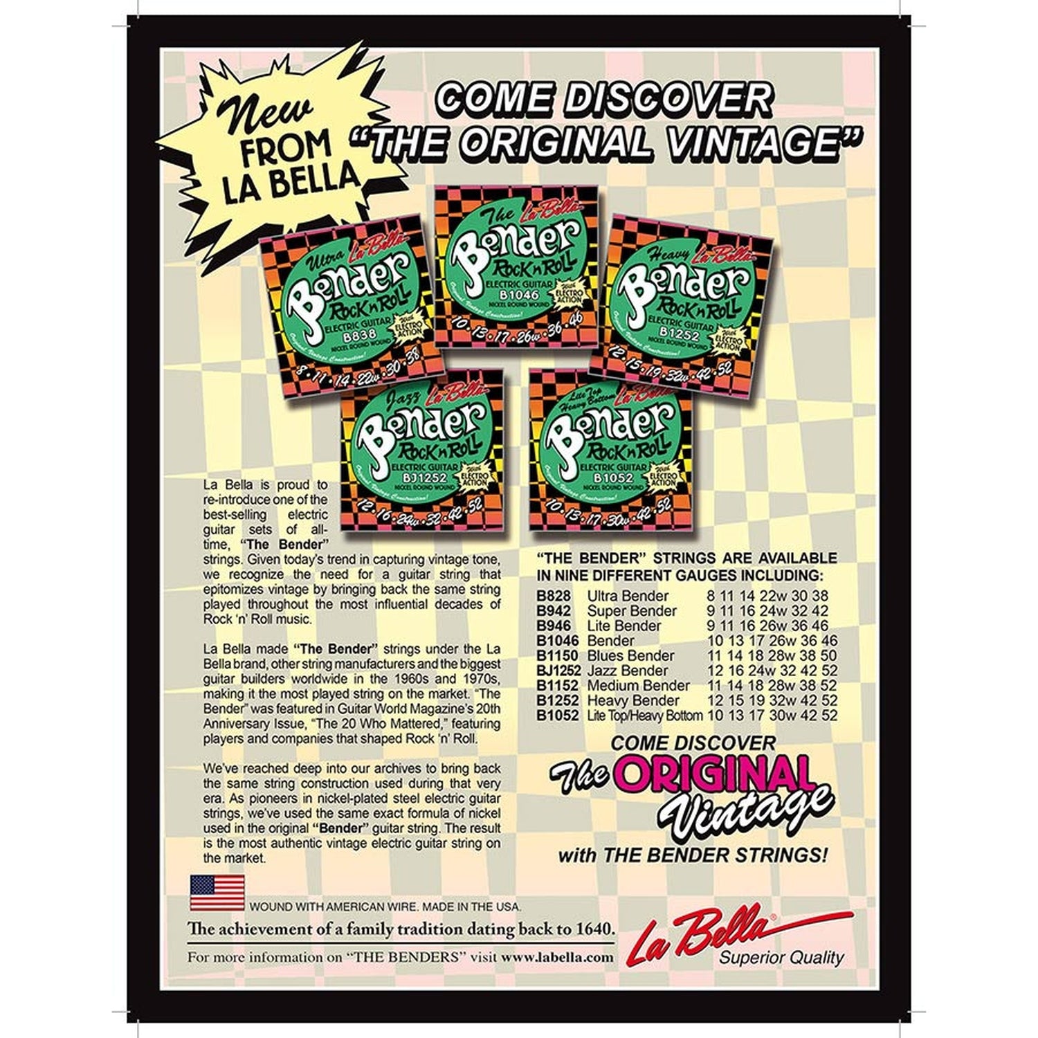 The La Bella L-B1150 Bender is a medium- tension electric string set based on the original design from the 1960s and 1970s—the golden age of rock 'n' roll. These strings are crafted using the authentic nickel-plated steel formula that La Bella used for major guitar brands and under its own name. With a rich, round, vintage tone, enhanced sustain, and excellent flex, these strings offer a true return to the tone that became iconic for a generation of musicians.