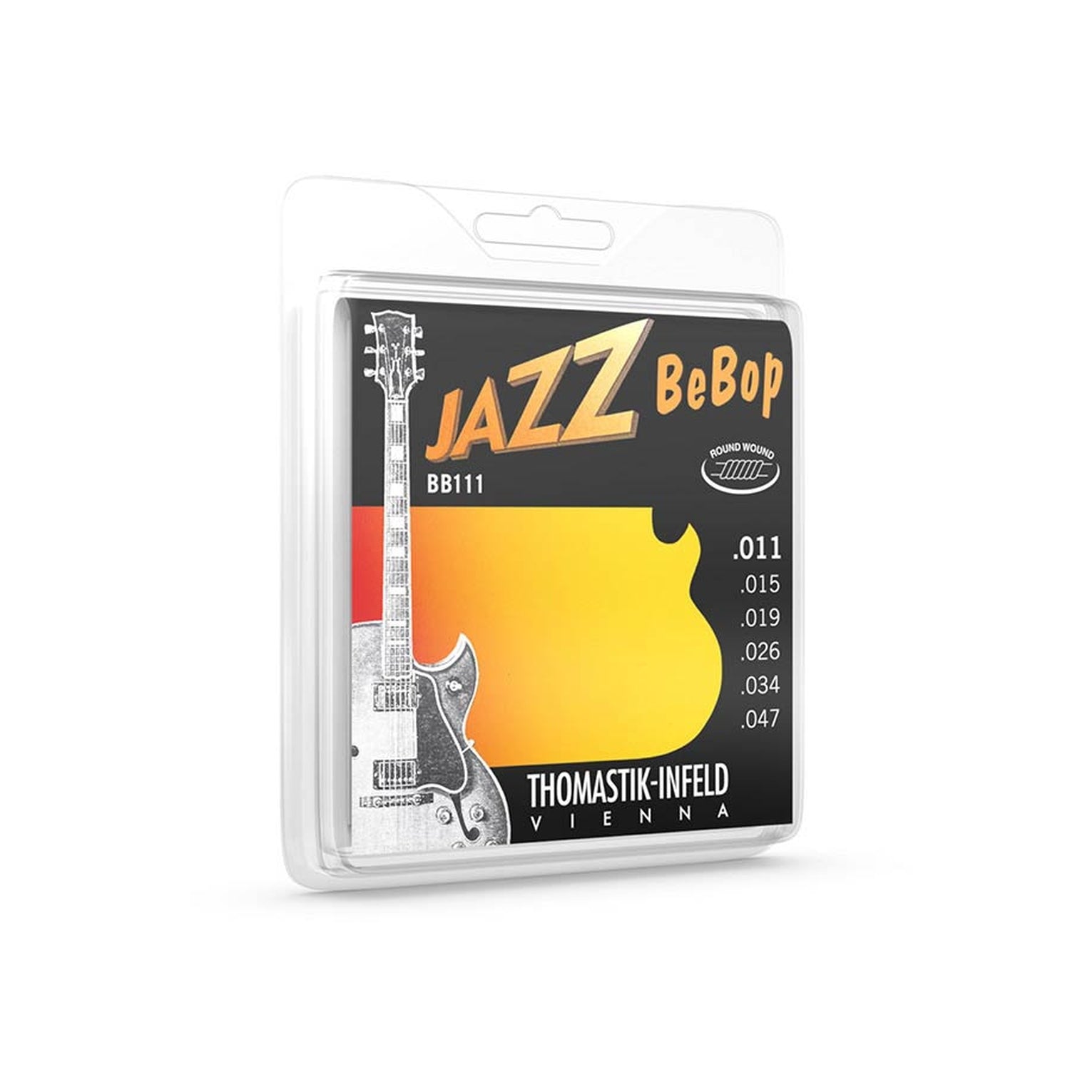 Thomastik Infeld THBB-111 snaren set elektrisch, nickel roundwound, 011-015-019-026-034-047 Probably the only round wound guitar snaar that can truly be called a jazz snaar. A similarity to the JAZZ SWING in materials and snaar architecture, but with a small gauge round wound nickel winding, produces a strong, fundamental rich jazzy tone that is somewhat brighter than a flatwound. This remarkable snaar is an excellent alternate choice or the player wanting real jazz tone, but with a bit more of an "edge".