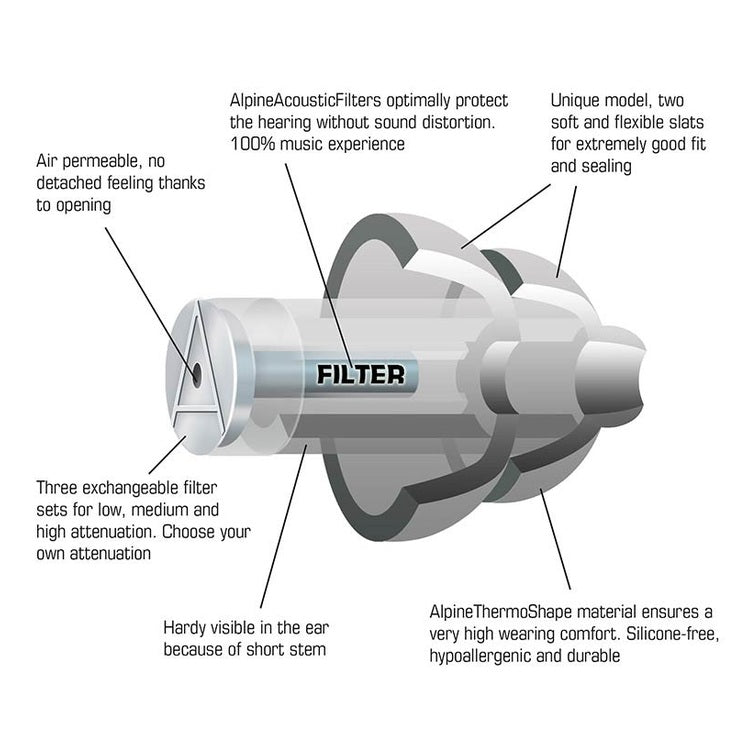 De MusicSafe Pro wordt geleverd met drie sets verwisselbare AlpineAcousticFilters™ (goud, zilver en wit). Hiermee kies je zelf het gewenste dempingsniveau: 16 dB, 19 dB of 22 dB. De filters verminderen schadelijke piekgeluiden, maar behouden de geluidskwaliteit van de muziek en zorgen dat gesprekken verstaanbaar blijven. Zo kun je in elke situatie de perfecte balans vinden tussen bescherming en beleving. Met zijn transparante uitvoering is de MusicSafe Pro bovendien subtiel en nauwelijks zichtbaar in het oor.
