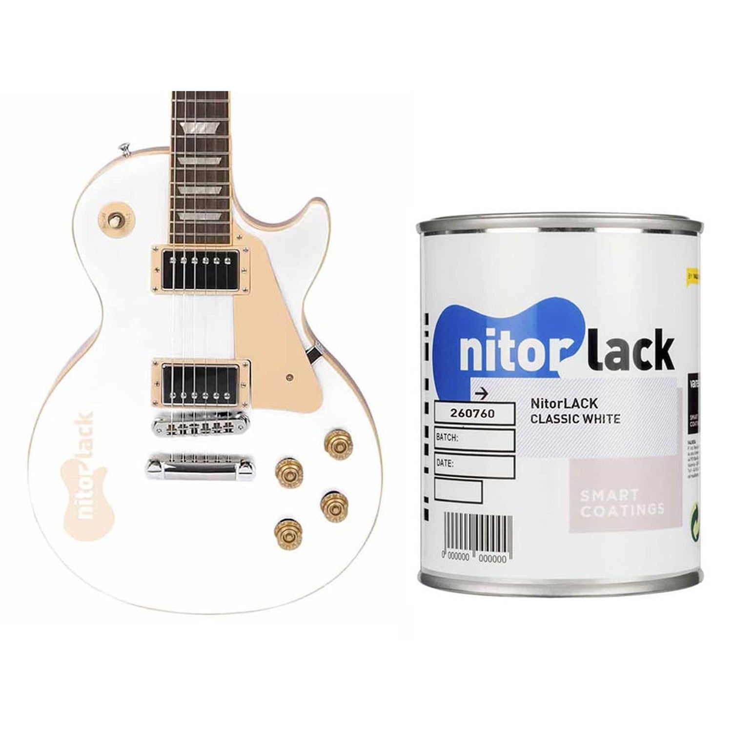 De NitorLACK N260760108 is een 500ml nitrocellulose lak in de kleur Classic White, ook wel bekend als "Alpine White" van Gibson. Deze helder witte afwerking is tijdloos en straalt elegantie uit, bekend van talloze iconische Gibson-modellen. De kleur komt optimaal tot zijn recht wanneer ze wordt afgewerkt met een transparante nitrocellulose toplaag, die niet alleen extra diepte toevoegt maar ook bescherming biedt tegen vergeling en slijtage.