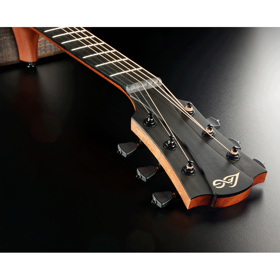 De hals is gemaakt van Khaya en wordt gecombineerd met een Black Brankowood toets en brug, wat niet alleen esthetisch fraai is maar ook zorgt voor een natuurlijke speelervaring. Dankzij de 350 mm radius, medium frets en 43 mm topkambreedte voelt de gitaar prettig aan in de hand. De zwart uitgevoerde hardware en oliebad-stemmechanieken zorgen voor een moderne afwerking én stemstabiliteit. De SAUVAGE-A wordt geleverd met een gewatteerde hoes, zodat je jouw instrument veilig overal mee naartoe neemt.