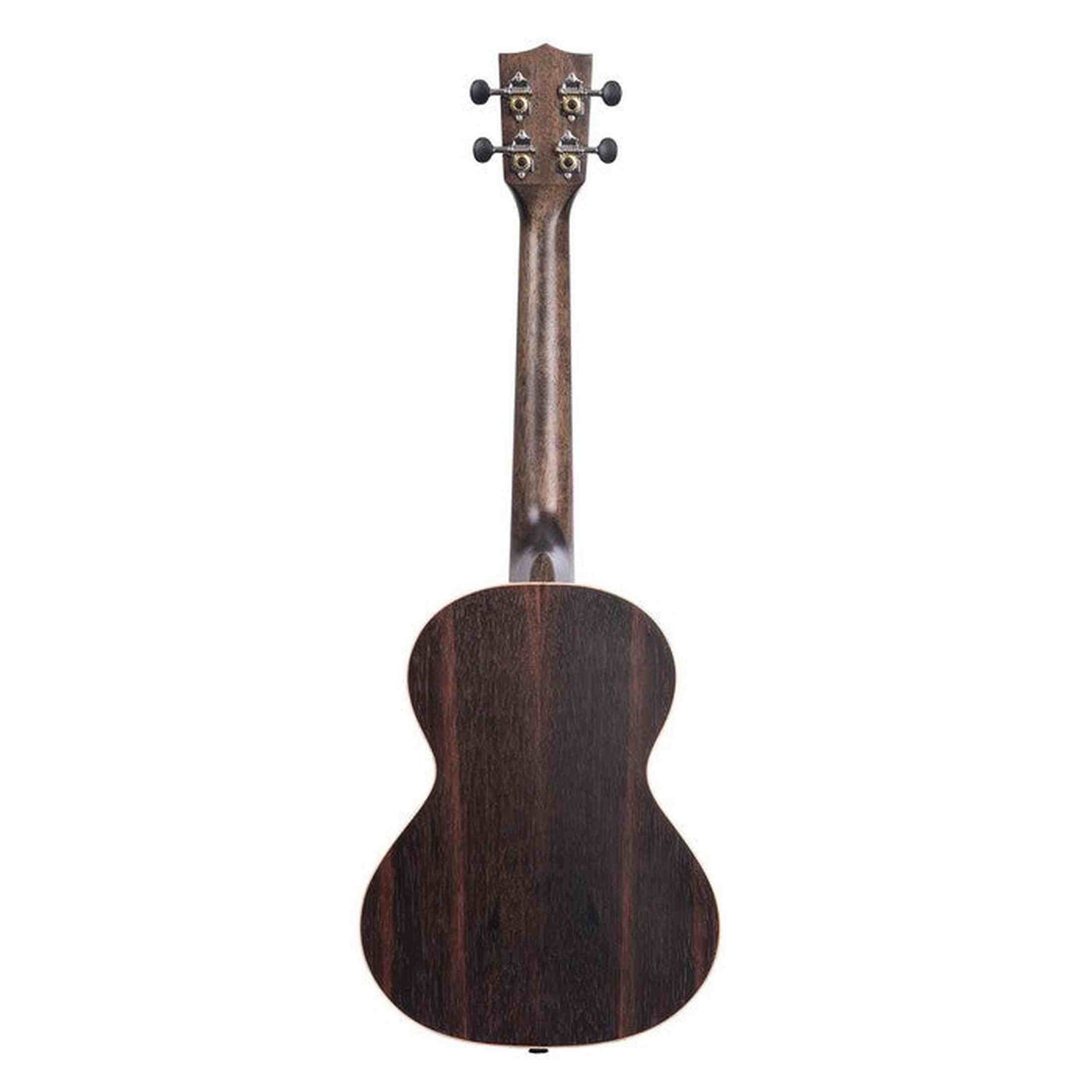 Die Kala Ebony Tenor-Ukulele besticht durch eine stilvolle Kombination aus Klang und Optik. Der Korpus ist aus gestreiftem Ebenholz in tiefen Brauntönen mit rötlich-braunen Akzenten gefertigt und mit einem seidenmatten Finish versehen, das für einen natürlichen Look sorgt. Die leichte Ahorn-Einfassung und -Rosette bilden einen schönen optischen Kontrast und runden das edle Finish ab.