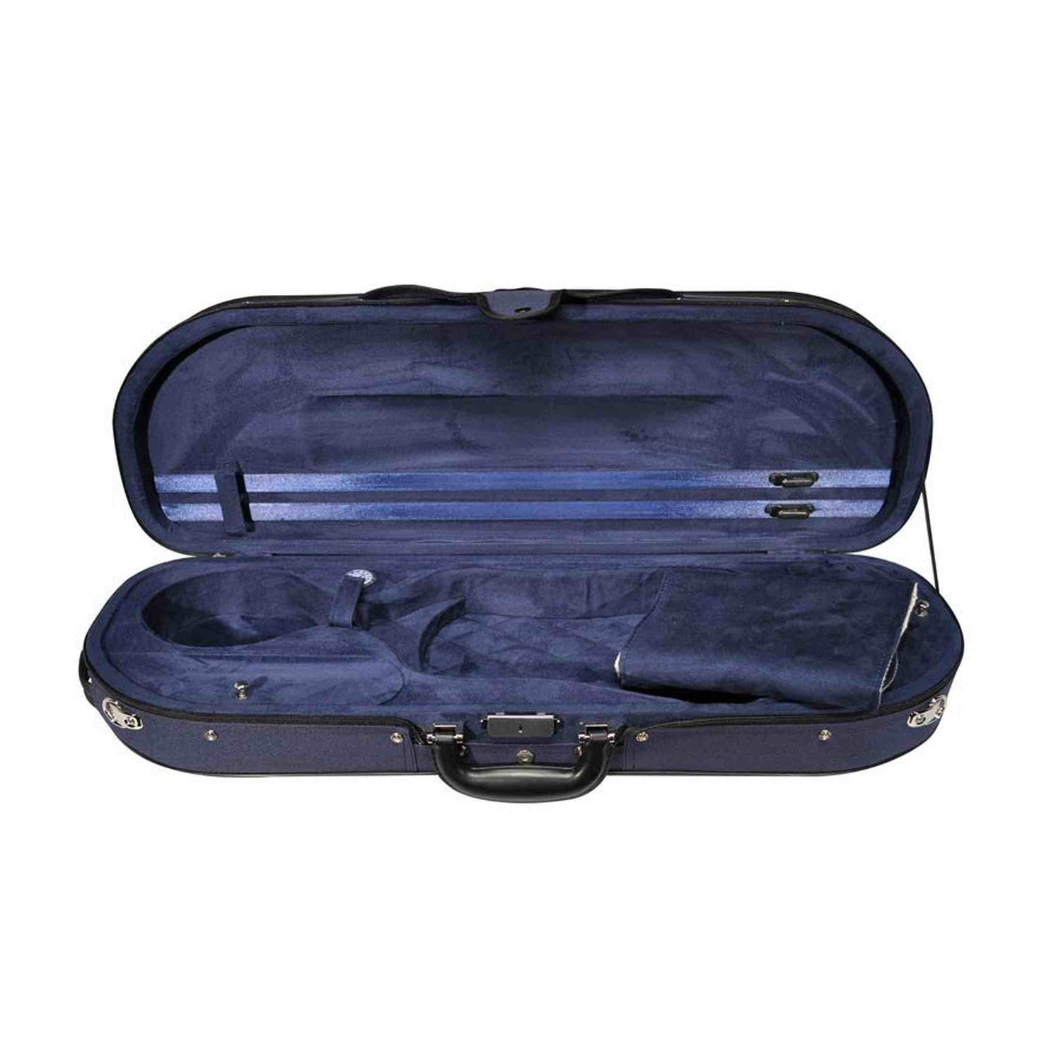 De binnenzijde is volledig gevoerd en afgewerkt met blauw suède. Je neemt twee strijkstokken mee en bergt accessoires op in de twee interne vakken. De snarenkoker en beschermdoek zorgen voor extra bescherming en overzicht. Met de twee rugriemen draag je de koffer comfortabel naar les en repetitie.