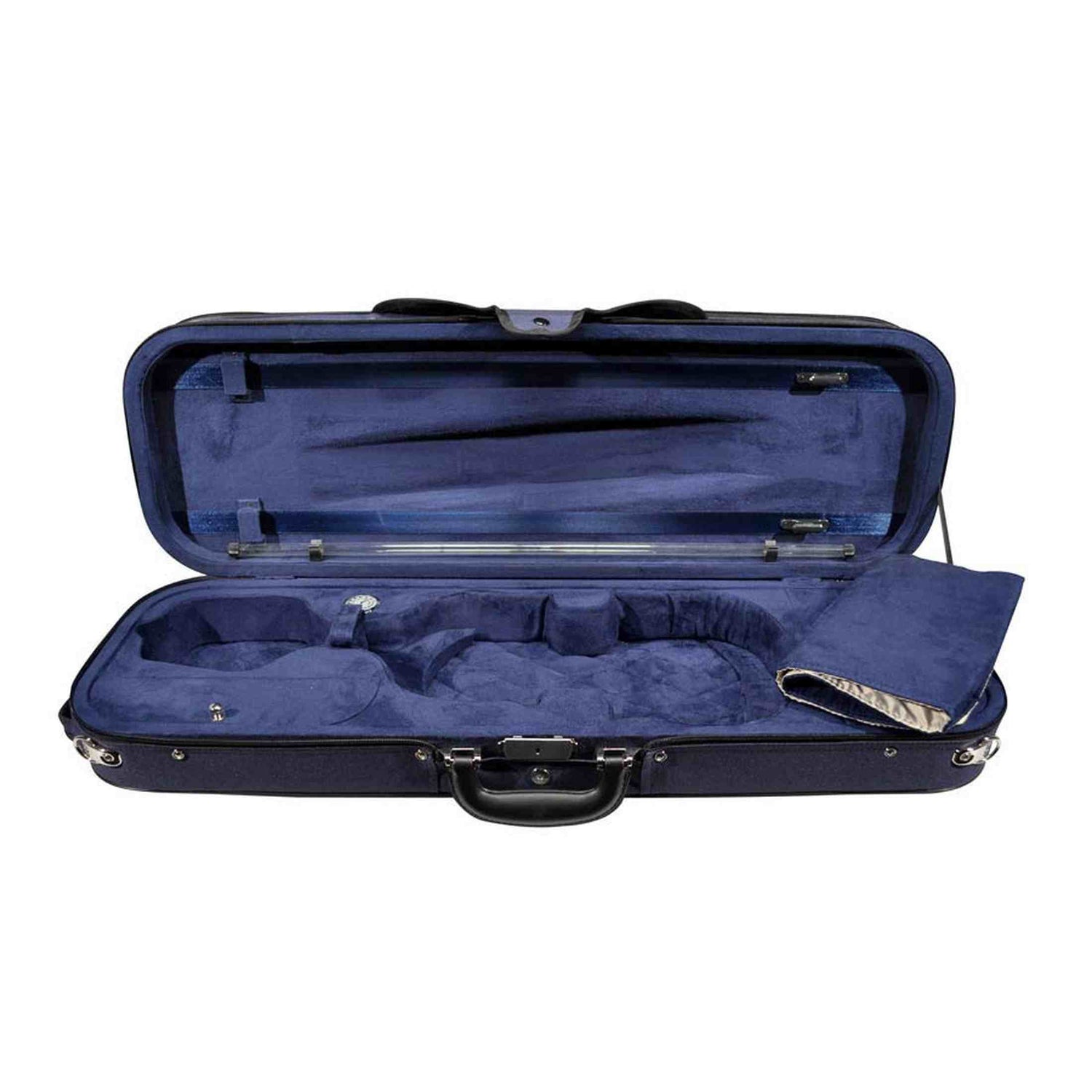 De buitenzijde is afgewerkt met sterke Cordura stof. Binnenin ligt je viool in een blauw suède interieur met beschermdoek. Je neemt twee strijkstokken mee en bergt accessoires op in de twee interne vakken. Met de twee rugriemen draag je de koffer comfortabel naar les, repetitie of orkest.