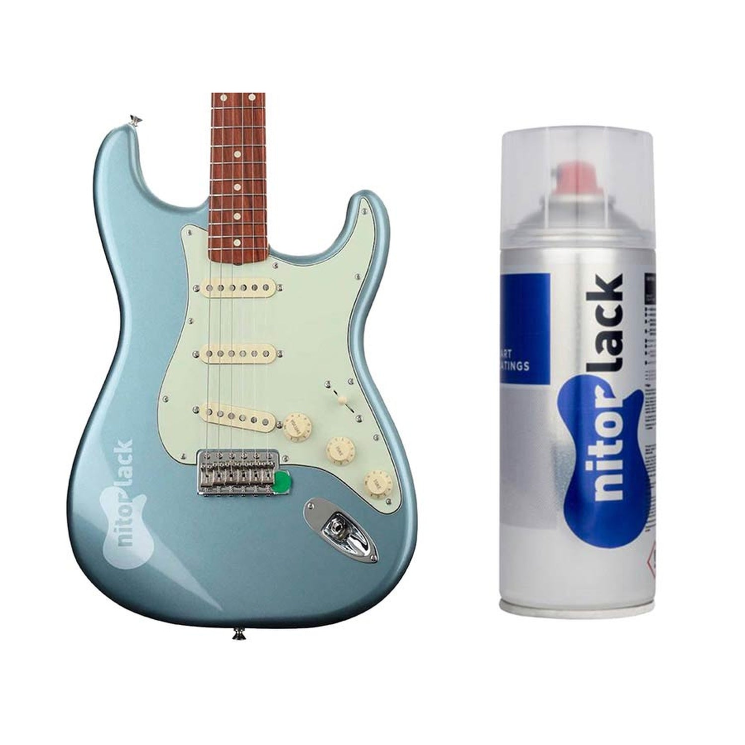 Der Nitrolack N250794160 ist ein 400-ml-Sprühdose mit Nitrozelluloselack in der exklusiven Farbe Blue Ice Metallic. Diese seltene Fender-Sonderfarbe wurde in den 1960er-Jahren in limitierter Auflage für Telecaster, Jazzmaster und einige Stratocaster-Modelle verwendet. Der Farbton ist ein kühles, eisiges Blau-Metallic, das mit der Zeit durch die natürliche Alterung des Nitrozelluloselacks einen grünlichen Schimmer entwickelt – ein Effekt, der sich auch direkt mit einem bernsteinfarbenen Klarlack erzielen lässt.