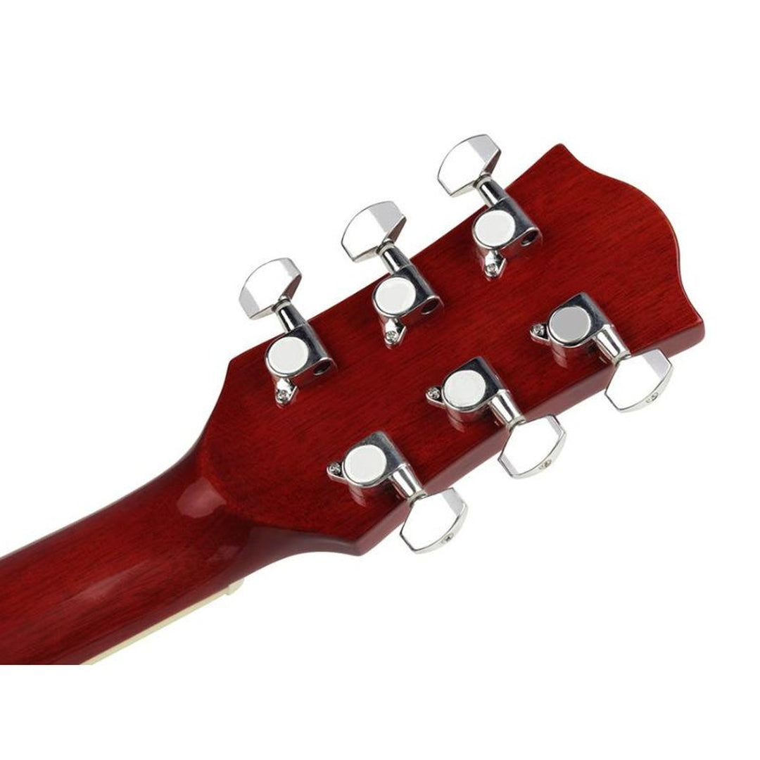Der Hals aus indonesischem Mahagoni liegt angenehm in der Hand und lässt sich geschmeidig spielen. Das Akaziengriffbrett mit elfenbeinfarbenem ABS-Binding sorgt für ein elegantes Finish. Verchromte Mechaniken garantieren Stimmstabilität, und die Hochglanzlackierung von Korpus und Hals verleiht der RD-12-RS eine ansprechende Optik. Eine hervorragende Wahl für alle, die eine zuverlässige Gitarre mit Charakter suchen.