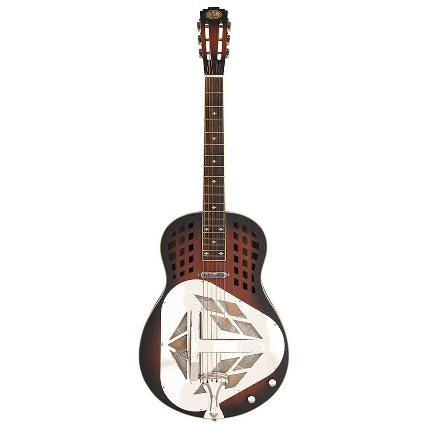 Die Royall DLT12SC/DSB Delta SC ist eine 12-bündige Tricone-Resonatorgitarre mit Mahagonikorpus, seidenmattem Sunburst-Finish und integriertem Lipstick-Single-Coil-Tonabnehmer. Diese Kombination erzeugt einen warmen, vielschichtigen Ton mit langem Sustain und hoher Detailtreue, der durch drei handgesponnene 6-Zoll-Aluminiumkegel noch verstärkt wird. Boden und Zargen aus Holz tragen zusätzlich zu Wärme und Tiefe im Klang bei. Dank des integrierten Tonabnehmers mit Lautstärke- und Klangreglern ist die Gitarre sofort bühnentauglich.